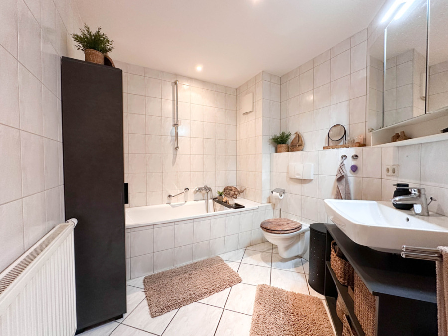 - ein hell gefliestes Badezimmer mit Dusche, Badewanne und WC,