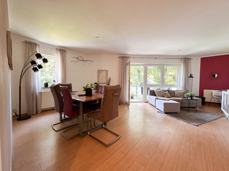 - ein großzügiges Wohnzimmer mit integriertem Essbereich und Zugang zum Balkon mit Blick ins Grüne,