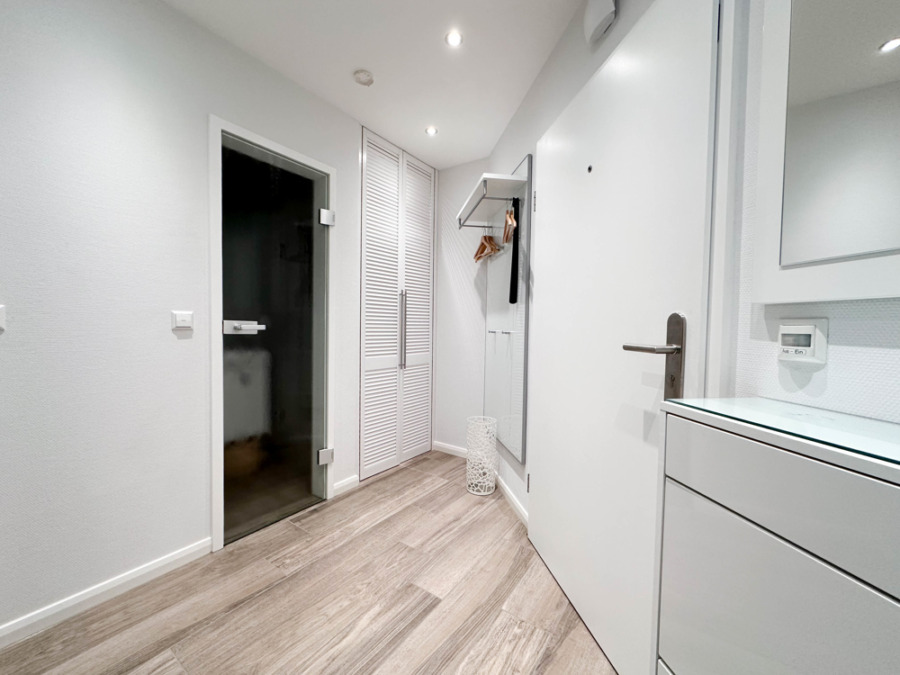 Ein elegantes Badezimmer mit moderner Dusche sowie ein separates WC sorgen für ein hohes Maß an Komfort und Wohlbefinden. Die helle Diele verbindet den Eingangsbereich mit dem offenen Wohn- und Schlafbereich sowie der angrenzenden Küche, die mit einer hochwertigen Einbauküche ausgestattet ist. Praktisch integriert in eine Nische mit Lamellentüren befinden sich zudem ein Wasch-Trockner sowie nützliche Reinigungsgeräte.