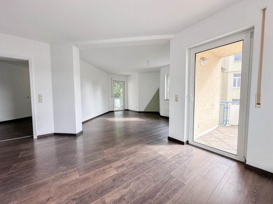 ein großzügiges Wohnzimmer mit integriertem Essbereich und Zugang zu den beiden Balkonen,