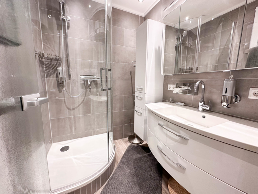 Für zusätzlichen Komfort sorgen ein elegantes Badezimmer mit moderner Dusche sowie ein separates WC. Die helle Diele verbindet den Eingangsbereich mit dem offenen Wohn- und Schlafbereich sowie der stilvollen Küche mit hochwertiger Einbauküche. In einer geschickt integrierten Nische hinter Lamellentüren finden sich ein Wasch-Trockner und nützliche Reinigungsgeräte – dezent verstaut und dennoch jederzeit griffbereit.